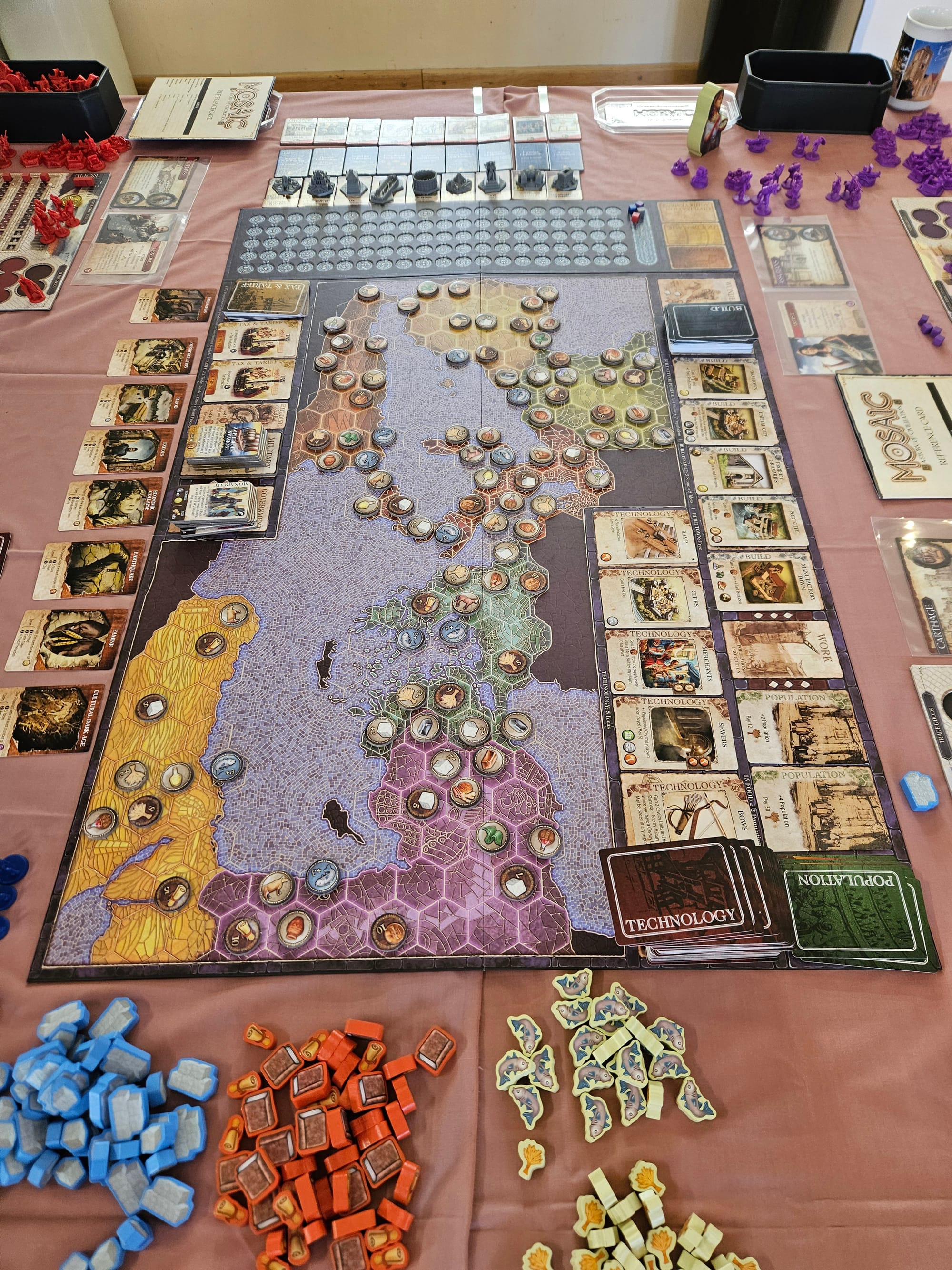 The LotR and Mosaic tables ran long into the afternoon. Despite valiant efforts, the Fellowship couldn’t overcome the shadow of Mordor—evil prevailed this time! Still, a thrilling journey through Middle-earth made for a memorable game.
