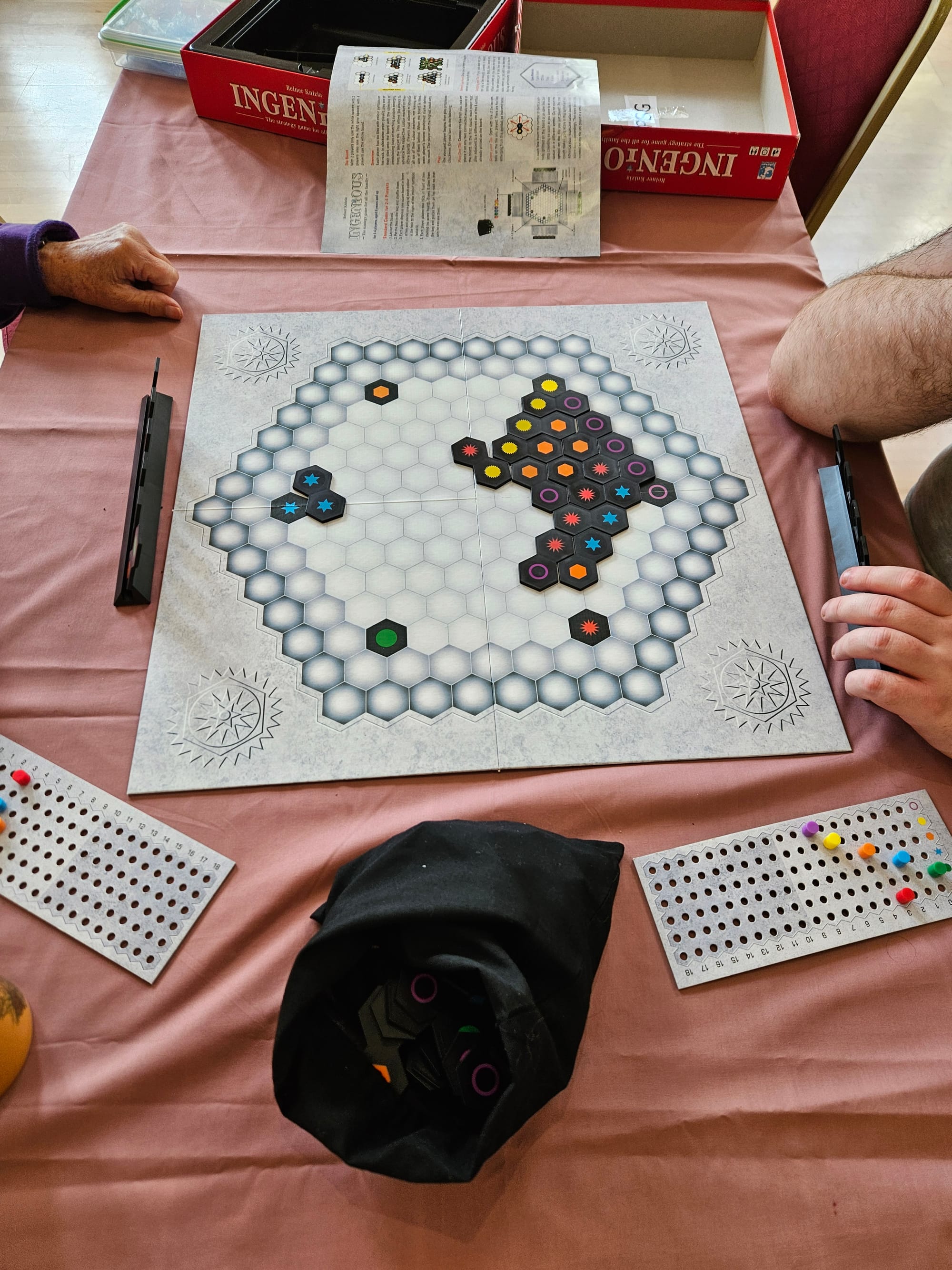 We kicked off September with a great mix of games across the tables. Two big games led the morning session: Lord of the Rings: Fate of the Fellowship, currently riding high in Board Game Geek's "hotness" chart, and Mosaic, a sprawling civilization builder that only hits the table occasionally—but always proves worth the time when it does. Meanwhile, another group opted for a pairing of classics: the ever-popular Ticket to Ride, followed by Reiner Knizia’s abstract gem Ingenious.