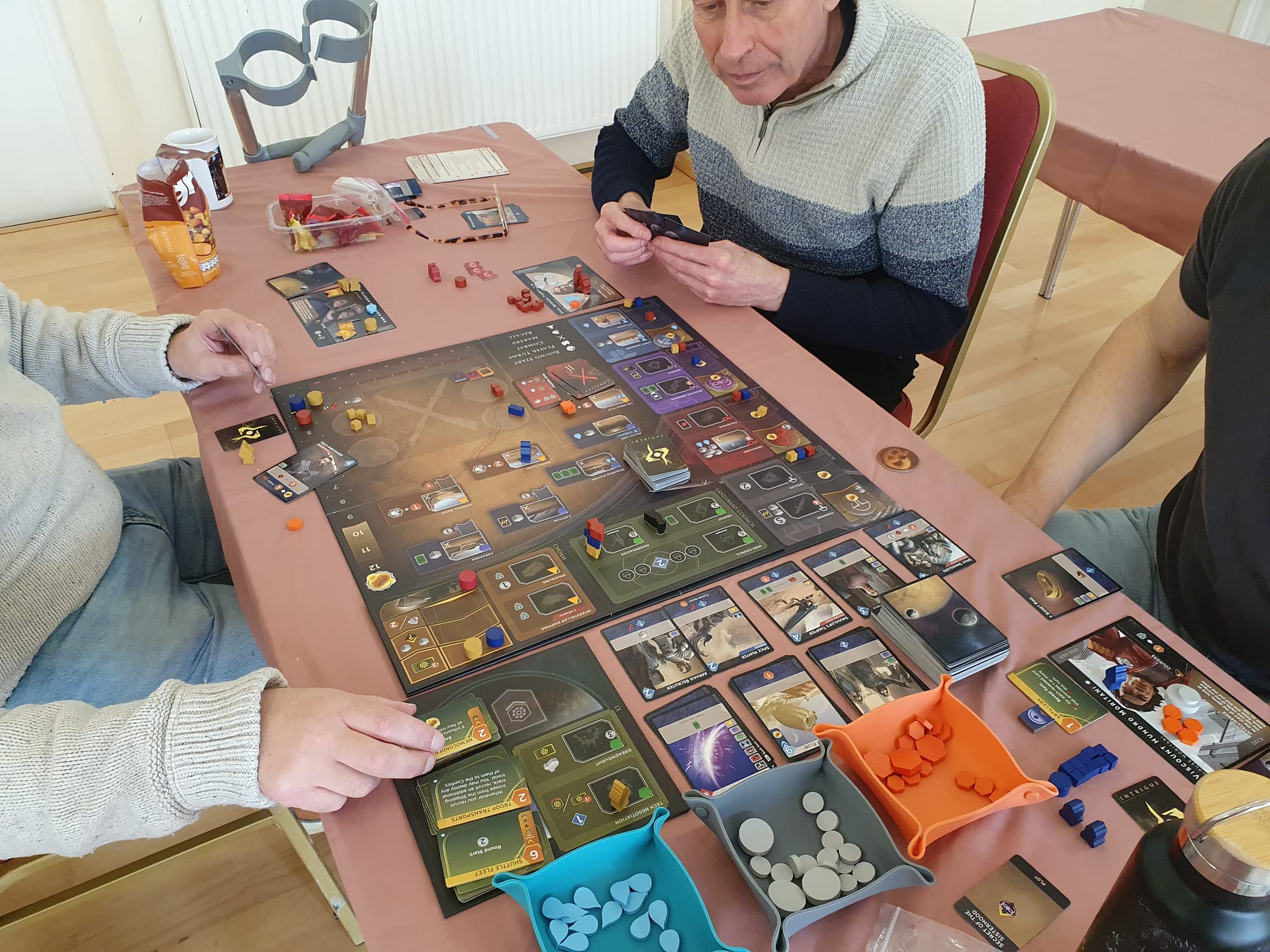 While the longer games continued the Dixit table moved onto the tile laying game Rome In a Day, in which players gain tiles using an 'I Cut, You Choose' mechanic. Later in the day the Seastrike players where joined by a late arrival and began a game of Dune: Imperium, a perennial favourite at the club.