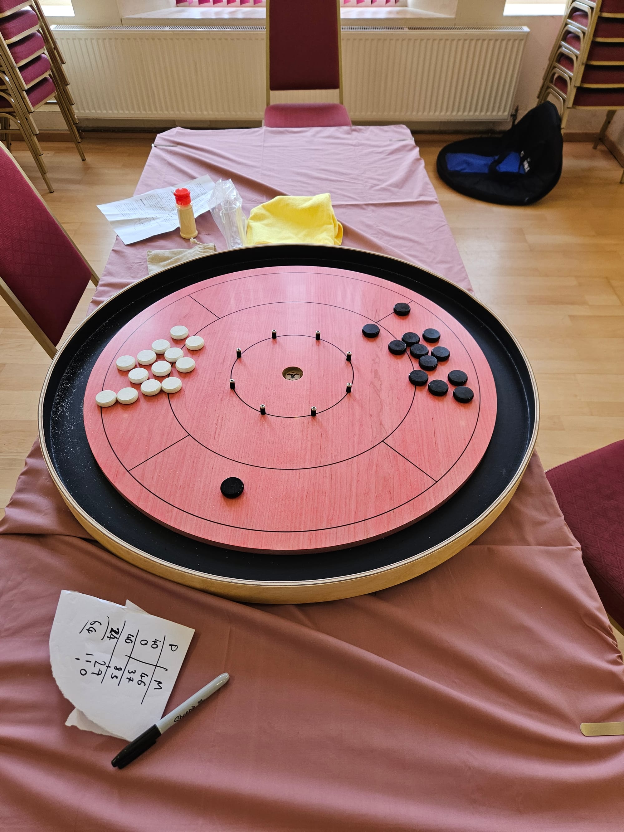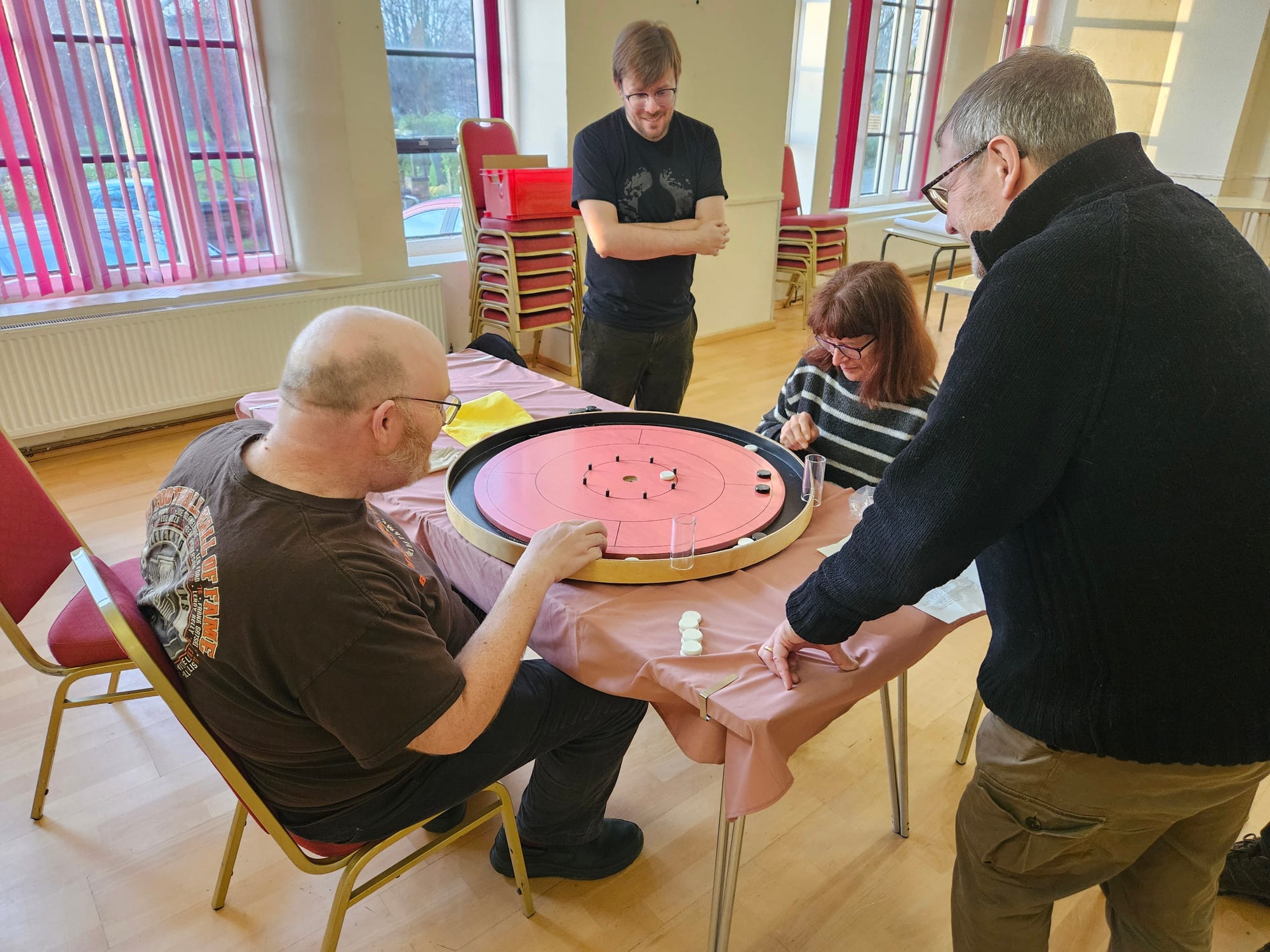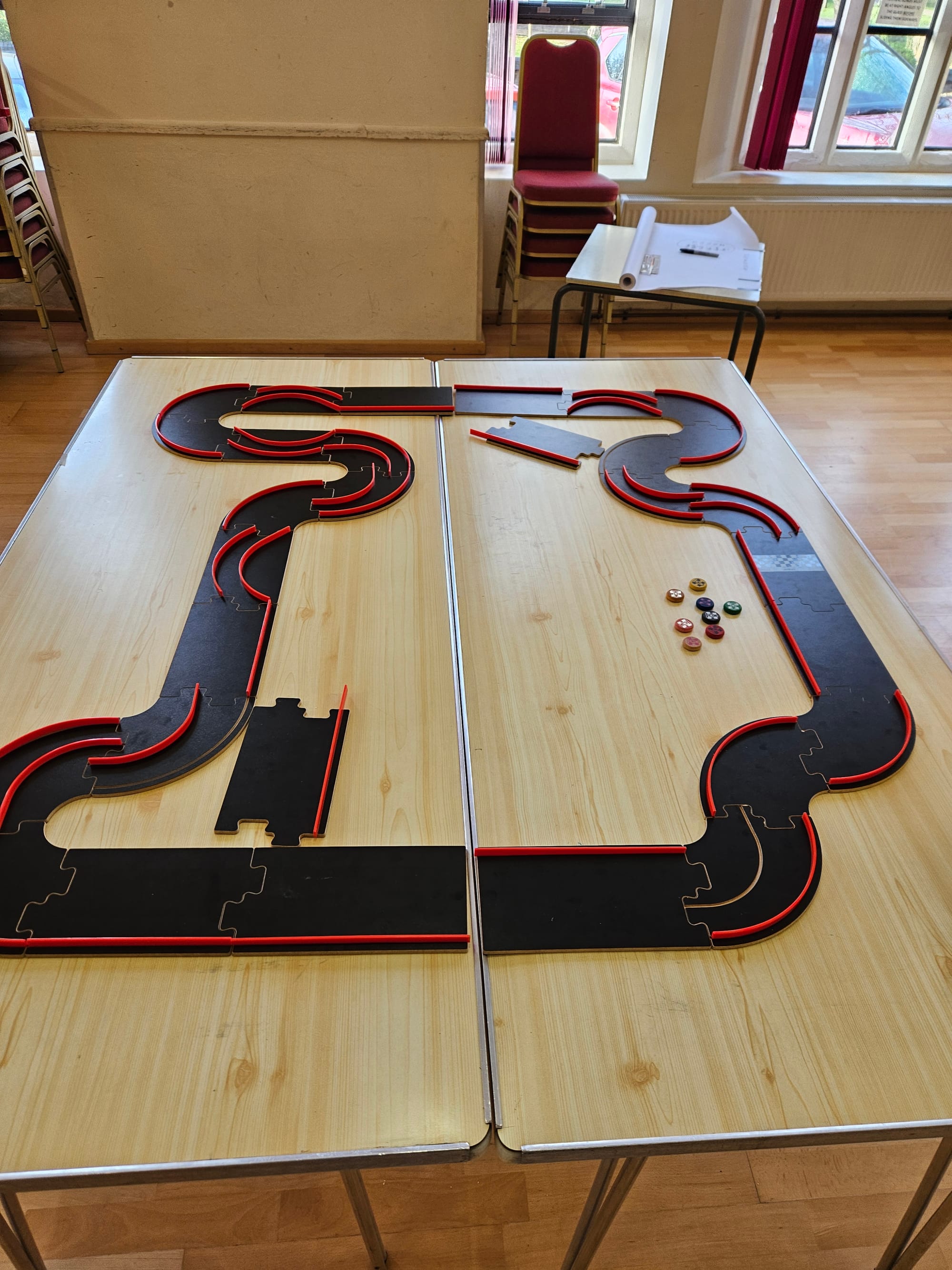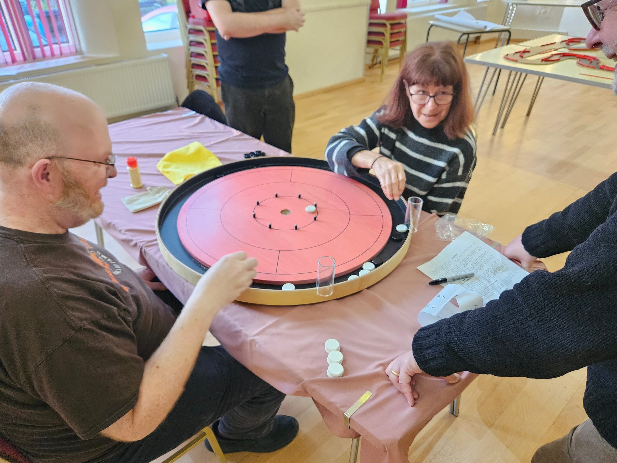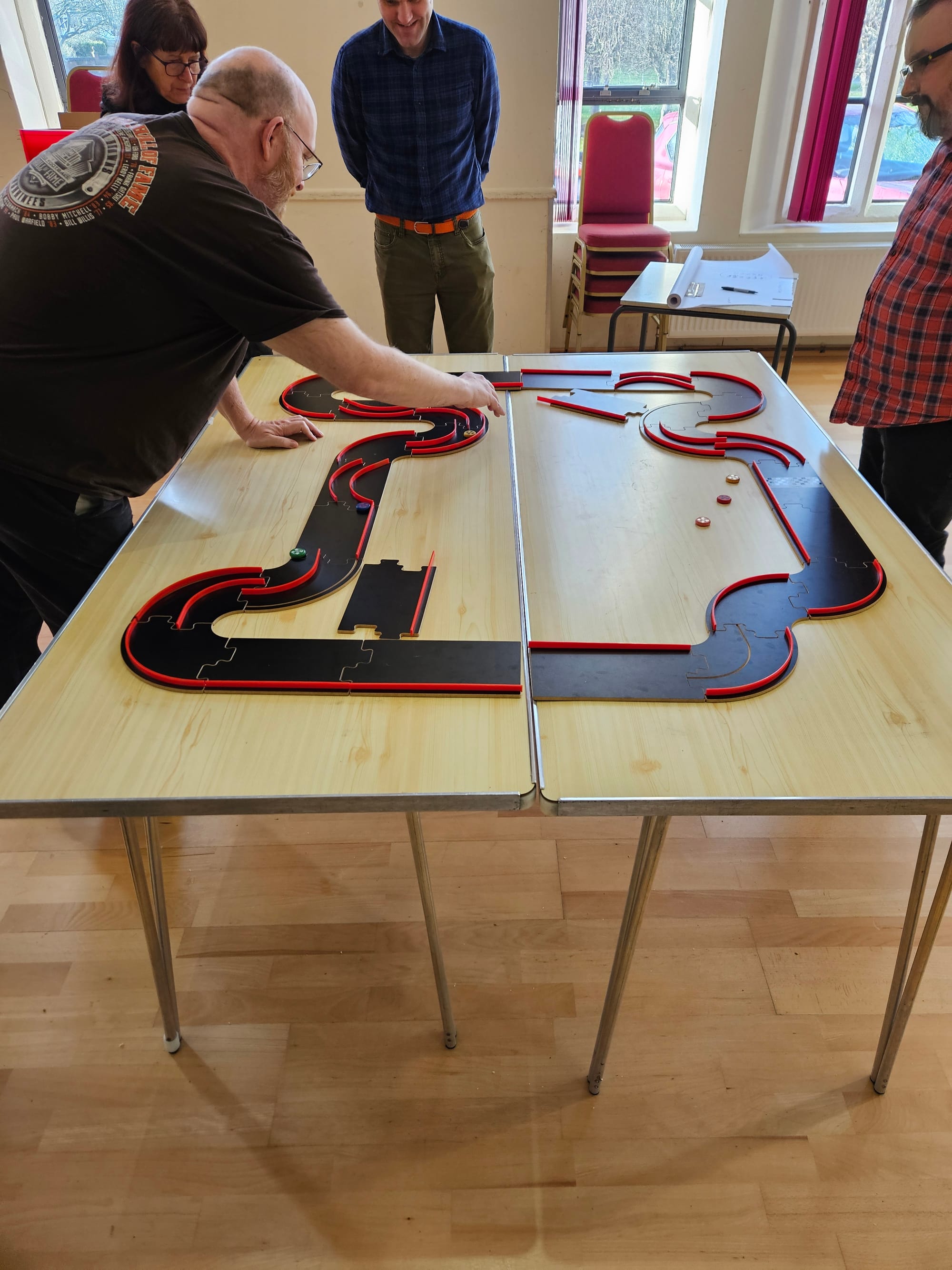 Running alongside everything was our traditional Pitch Car competition. Throughout the meetup, each table took turns to compete, flicking wooden discs around the course in pursuit of racing glory. But Pitch Car wasn't the only spectacle, this year Crockinole made an appearance... a very different disc-flicking sort of game to Pitch Car!